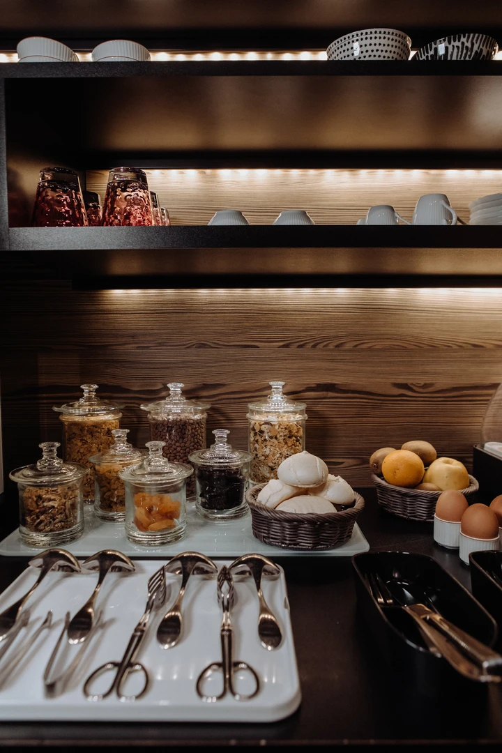 The brunch is all-you-can-eat, buffet-style. Freshly squeezed juice is served at the table. We have a choice between a large glass of freshly pressed oranges, grapefruit, or lemons. Our oranges come directly from our Portuguese producer in the Douro Valley, as we purchase his entire production each year. This allows us to certify the quality and absence of any pesticide treatments. The buffet consists of mini pastries, bread, pancakes (with maple syrup), as well as the essential eggs, various cold cuts, and cheeses. On the savory side, pies, mini croque-monsieurs, and smoked salmon plates are offered. For desserts, cakes, as well as mini macarons, éclairs, financiers, and canelés are available. Hot beverages are also unlimited: tea, coffee, hot chocolate.